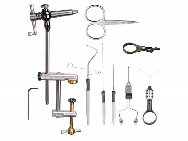 Original engl: Complete set which includes a Flylab vise and 7 fly tying tools. Supplied in a strong case whose rubber interior is shaped to give each tool a precise housing. Contents: Flylab vise, small Scissor, Bobtec1 bobbin with adjustable thread tension, Bobbin threader, Finisher-Conical finisher, Bodkin, Hackle pliers, Rotodubbing mini, Allen Key. Inside detailed instructions of the vise and various tools.