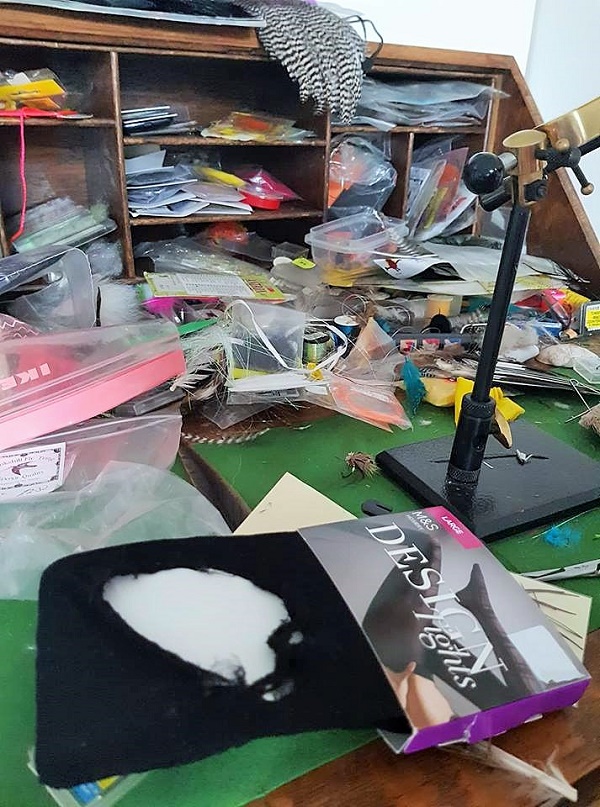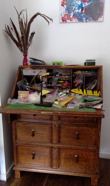 Svoj radni sto za vezivanje muha sam napravio na pisaćem radnom stolu koji sam dobio od ženinih kada smo se doselili u Škotsku.