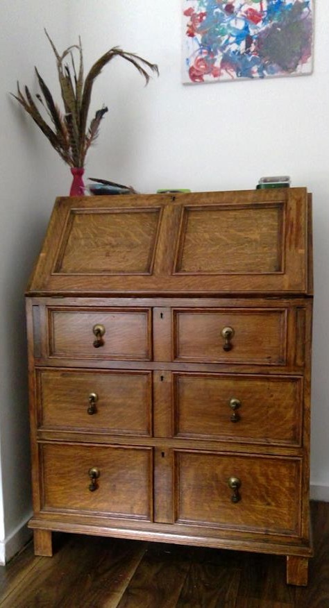 Znam samo da je od ženine bake, a ko će znati koliko je to staro. Saznao sam da je iz 19. vijeka. Ženin otac ga se sjeća od rođenja. Dosta je težak, ima preko 100kg. Ovde je ovakav sto jako skup i teško se nalazi, posebno ovaj koji nije nigdje ogreban. Ima radnu ploču na preklop i u donjem dijelu šest velikih ladica. Kada se preklopi radna ploča i prostor otvori ima puno pregrada za razne materijale od kojih vezujem svoje imitacije muha.