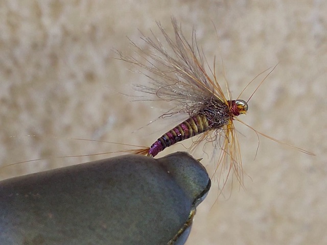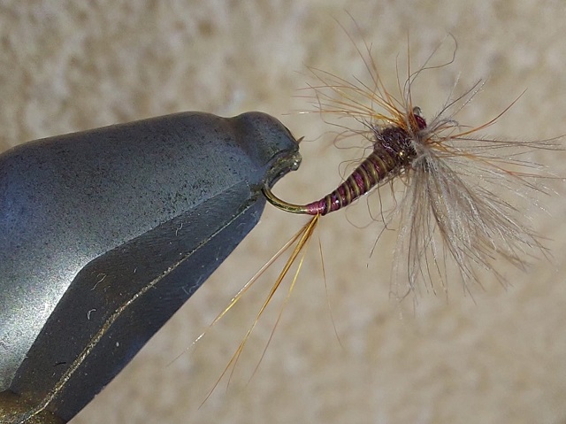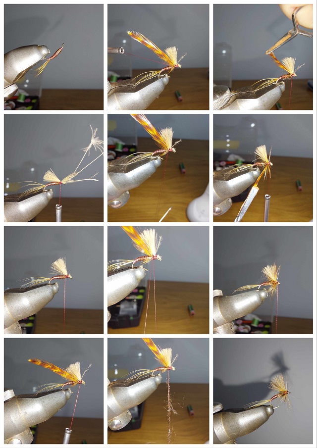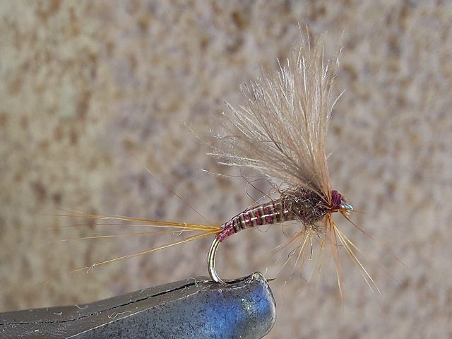 Za izradu tela koristim osnovni svetli bordo konac koji može biti bilo koje marke, al’ da bude debljine 10/0, ne ispod toga i guljeni paun natural boje kojim se telo porebrava uz ravnomerno motanje. Za rep koristim pero od prirodnog materijala sa skalpa petla boje braon – riđa. Za izradu grudi koristim klasičan dabing tamno braon, a za krila svetliji cdc pera 2 ili 3 komada, sve zavisi kakvo je pero. Finiš nogice skalp od petla iste boje kao i rep muve.