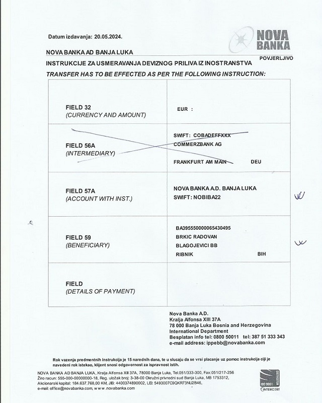 Devizni račun za prijatelje iz inostranstva koji žele da pomognu je 5550000065430395 na ime Radovan Brkić, uz priložene instrukcije za transakciju preko SWIFTA-a.