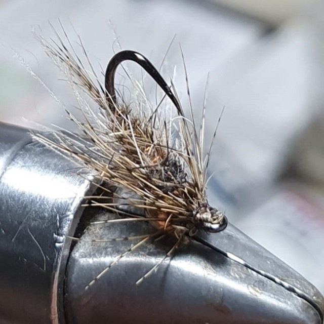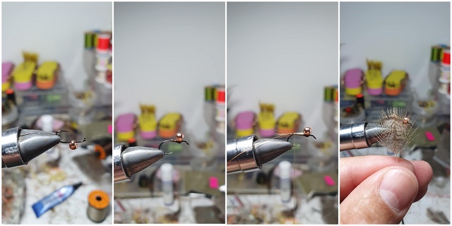 Slika 6: kod završnog dela ove nimfe pričvrstim konac na vrat udice i razdvojim konac, stavim malo dabinga od zečijeg uha i pero od jerebice; navrtim konac nekoliko puta i fino idem do oko udice gde nogice sa prstima teram nazad.
