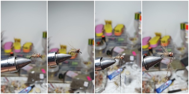 Slika 3: vežemo rep od jerebice i barkarna žica za rebra i formiramo konus. Pero jarebice od koje pravim rep isto koristim i kod završnog dela nimfe.